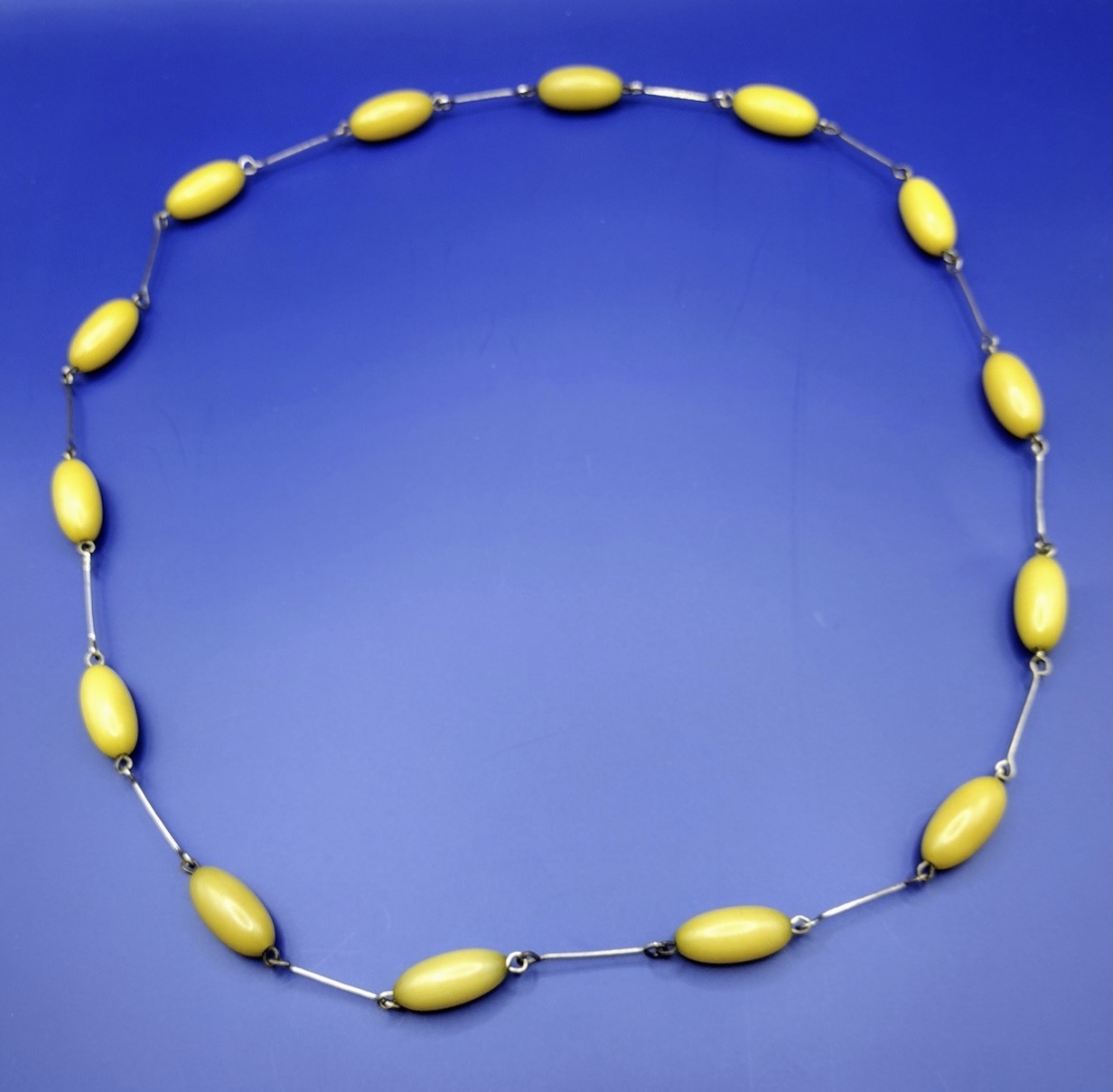 Vintage early 1930s faux amber long beaded necklace, featuring warm autumnal tones of orange and yellow, set along a delicate chain.